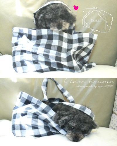 梅雨どきのムシ暑さに参ります。 ワンコたちも涼しくなってからのお散歩ですが 舌が右に左にペロ~~~~ンってなるこの子。 お散歩中。草を引きむしりながら歩くこの子。 愛しい。 人間でゆぅ天然ってやつですか。 疲れも吹っ飛びますわ。 いつぞや作った簡単バック。 我先にと入ろうとするけどうまく入れず 入れてあげました。 愛しい愛しい。ああ。いとおしい。